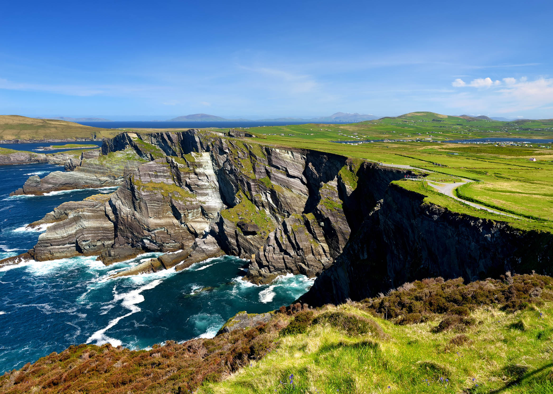 Desayuno en el hotel. Hoy salimos sobre las 08.00hrs para aprovechar bien del día. El dia nos llevará al asombroso Condado de Kerry, haciendo una parada en los impresionantes Acantilados de Moher, que se elevan 214 metros sobre el Océano Atlántico. Después, continuará hacia la histórica ciudad de Limerick, donde explorará su castillo normando y el encantador Barrio de los Tratantes. Almorzamos en Limerick antes de llegar al Condado de Kerry, donde se alojará por las próximas dos noches. Cena y alojamiento en el Castlerosse Park Resort 4* (Co. Kerry)