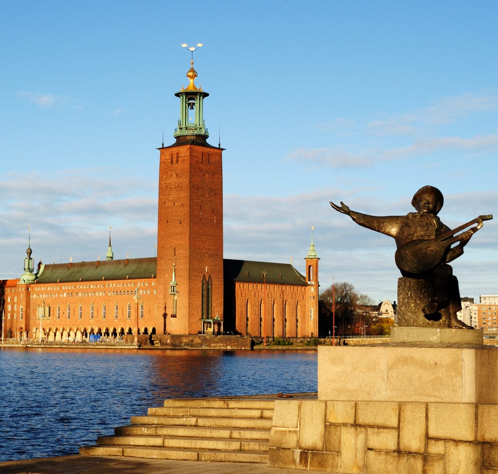 Graças ao seu atrativo pináculo com três coroas de ouro, a Câmara Municipal de Estocolmo é um dos edifícios mais famosos da capital.