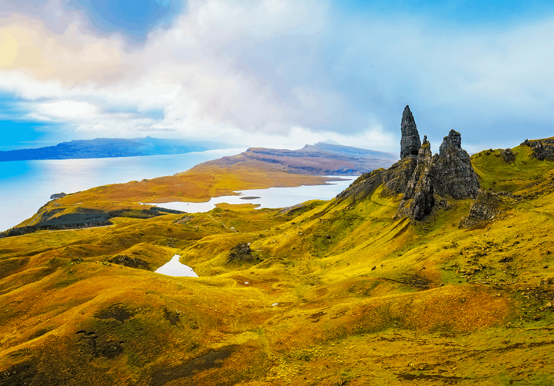 The Isle of Skye provides Highland scenery on an epic scale, from sensational seascapes to misty ancient lochs there are plenty of photographic opportunities. Visiting the extraordinary Quiraing with its dark velvety green slopes and craggy hilltops and on to the aptly named Kilt Rock we finally get the chance to marvel at the pinnacle of rock known as the Old Man of Storr.